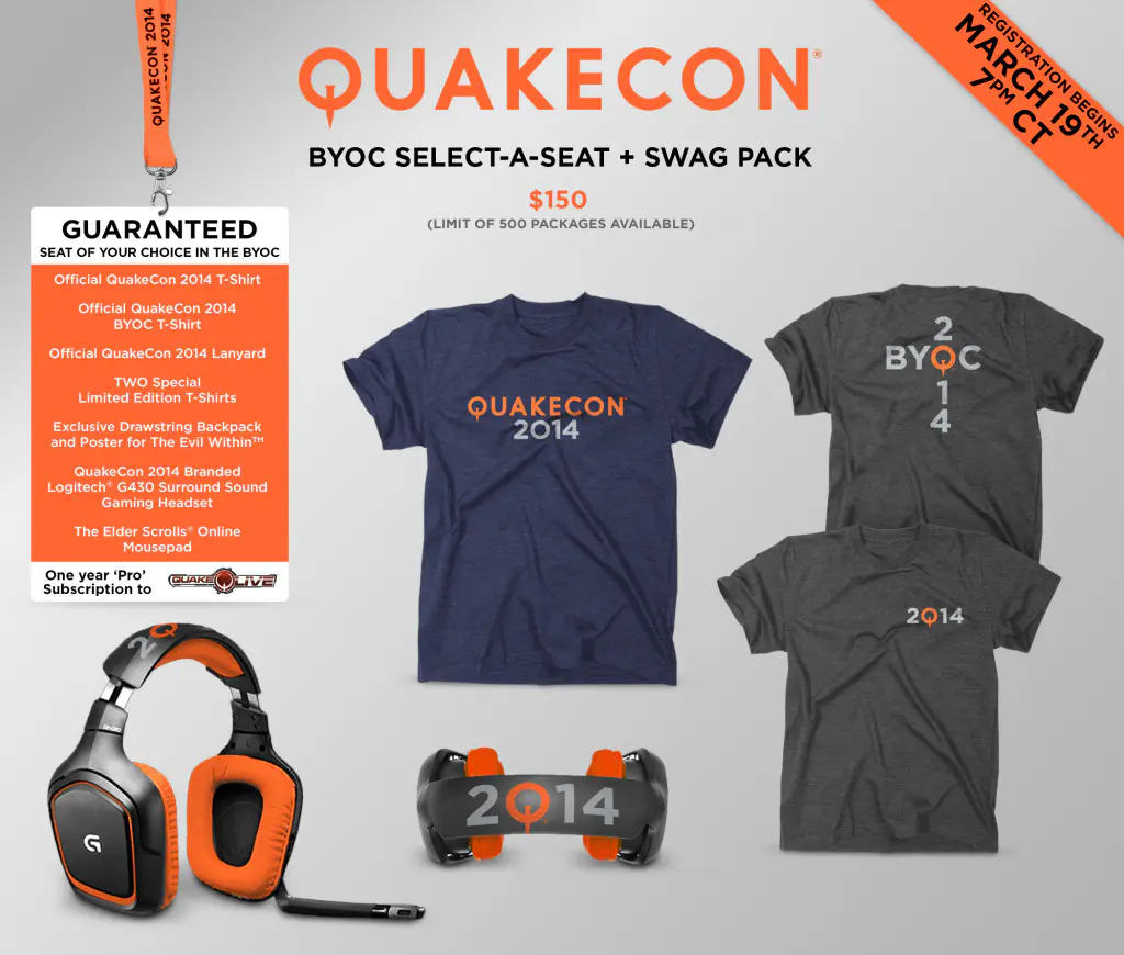 While general attendance will remain free, attendees wishing to participate in the QuakeCon 2014 BYOC, must pre-purchase one of the ‘BYOC Select-a-Seat’ packages through our online registration site to guarantee a seat. Once the packages sell out, they will be giving people the opportunity to win BYOC seats via social media giveaways, contests, and the event partners leading up to the show! As all seats will be accounted for prior to the show. This year will not have seats available on-site or on a first-come-first serve basis.