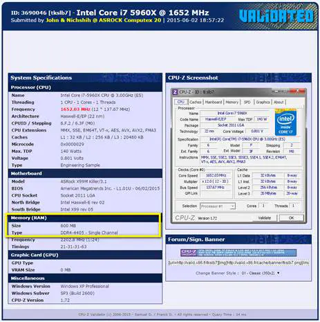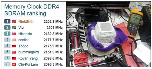 Nick Shih, the master of overclocking and his friend John Lam from HKEPC OC has already broke a world record by overclocking a G.SKILL Ripjaws4 DDR4 3400 4GB memory module to an unearthly 4405MHz on the new motherboard! By using Intel Core i7 5960X CPU with 1652MHz and ASRock Fatal1ty X99M Killer/3.1, the memory frequency rocketed to an eye popping 4405MHz! (http://valid.canardpc.com/tkslb7 )