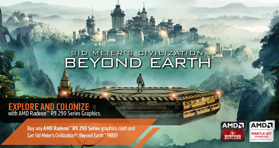 Users who purchase an AMD Radeon R9 295X2, R9 290X and R9 290 graphics cards starting November 6, 2014 can qualify for a complimentary copy of Sid Meier’s Civilization: Beyond Earth, which takes advantage of the larger framebuffers offered by the R9 series. More information is available below from the official press release