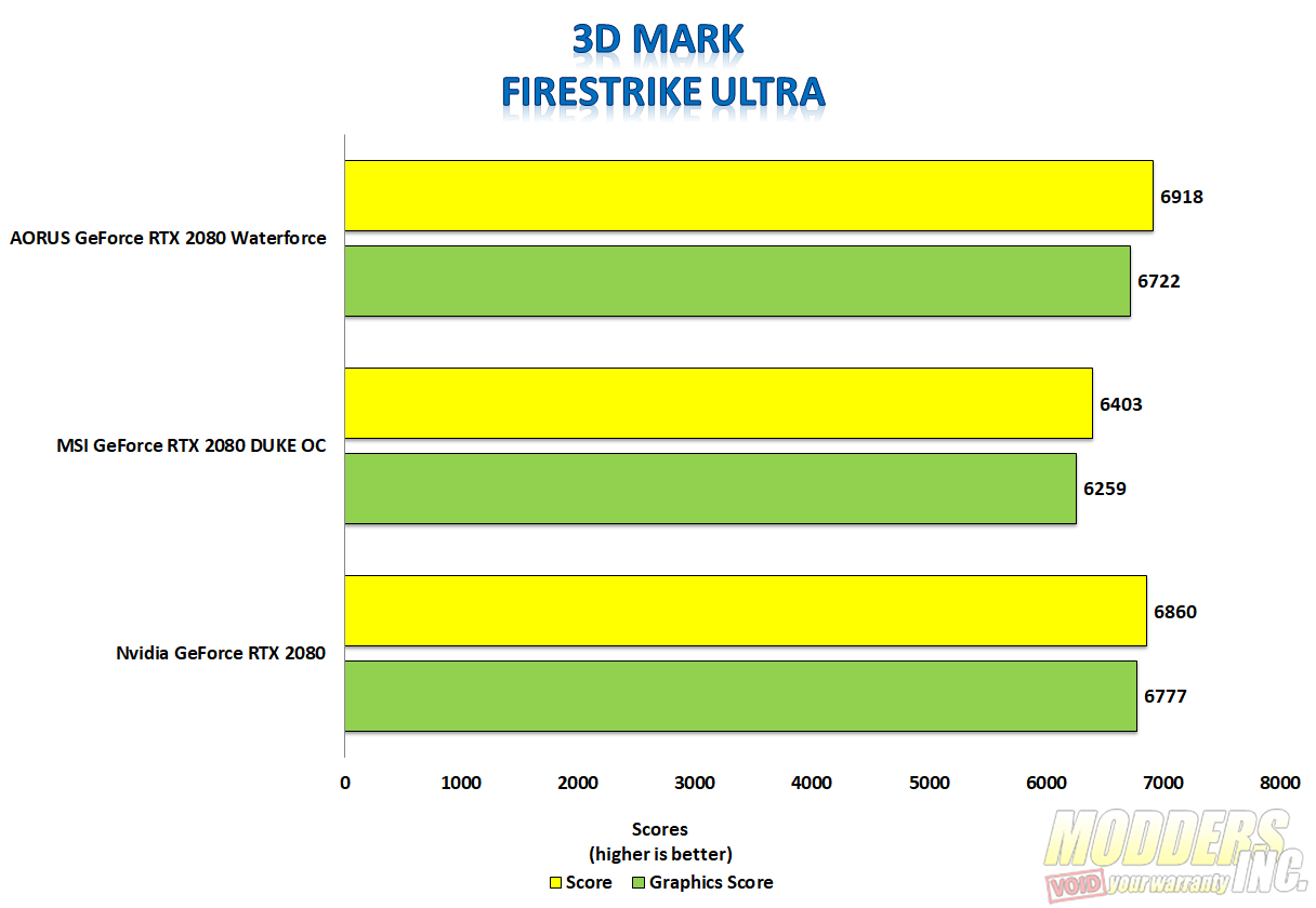 As you can see from the charts, The AORUS Waterforce Xtreme 2080 beat out both the MSI RTX 2080 Duke OC and the reference RTX 2080 in not only Time Spy Extreme, but also Firestrike Ultra. In Firestrike Ultra, the AORUS Waterforce RTX 2080 achieved an overall score of 6918 and a graphics score of 6722. In Time Spy Extreme, our Waterforce 2080 achieved an overall score of 5249 and a graphics score of 5299.