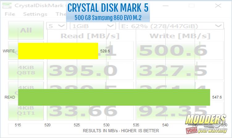 The ATTO Disk Benchmark utility was designed to measure regular disk drive performance. However, its more than capable measuring both USB flash drive and SSD speeds as well. The utility measures disk performance rates for various sizes of files and displays the results in a bar chart showing read and write speeds at each file size. The results are displayed in megabytes per second. Crystal Disk Mark 5. The Intel 660p achieved read a speed of 1794 MB/s and a write speed of 968 MB/s. These were both very close to the drives advertised speeds. The 860 EVO achieved a read speed of 550 MB/s and a write speed of 529 MB/s, essentially saturating the SATA 6 interface and either matching, or going over its advertised speeds.
