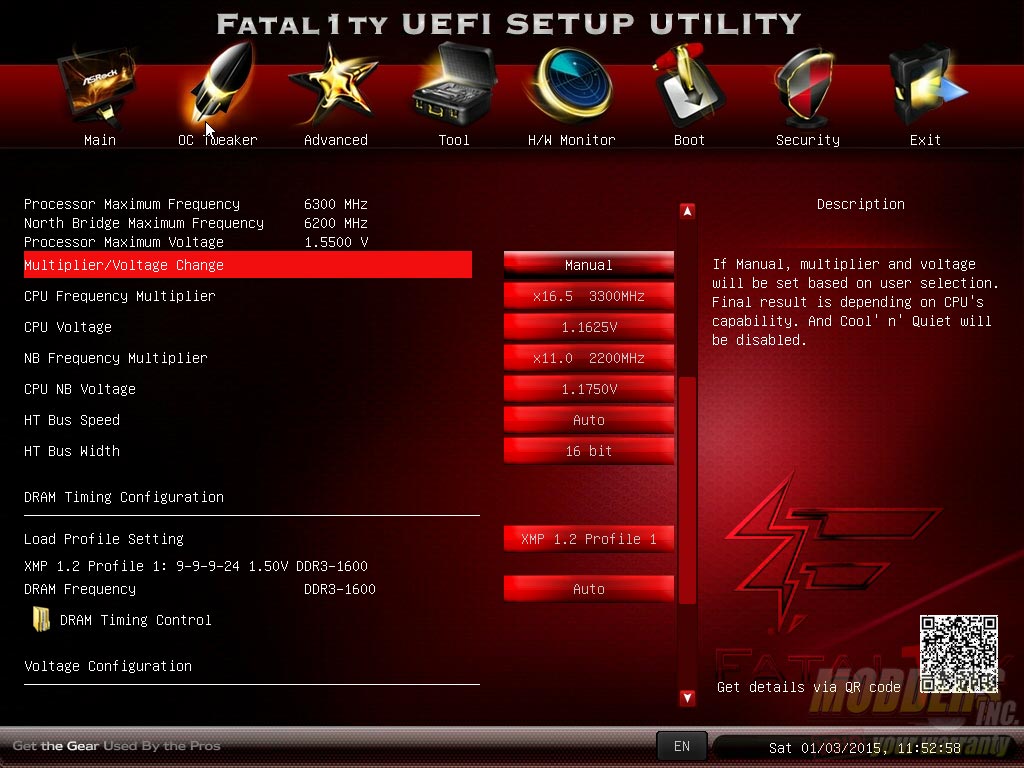 There is also a CPU OC mode which overclocks the CPU from set percentage profiles built-in to the UEFI. The DRAM frequency multiplier provides up to 2400 MHz options.