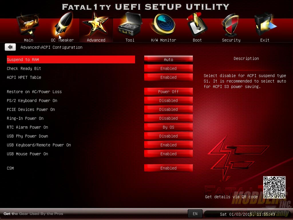 The Tool section contains some very interesting features such as the System Browser (visual overview of the motherboard and plugged in components), Online Management Guard (adjustable schedule for internet system usage), UEFI tech service (direct line to ASRock Tech Support), RAID installer, UEFI instant flash and the Dehumidifier function which can turn on your system automatically even when you are away so that moisture does not build up. Custom profile options can also be saved and loaded in this page.