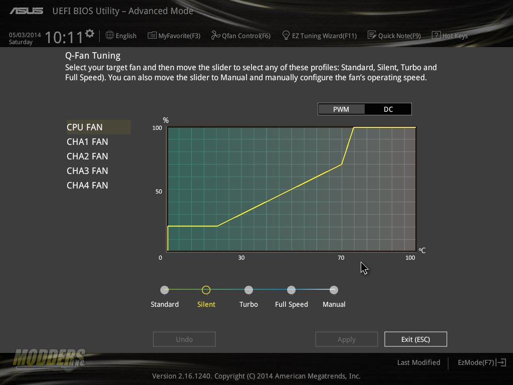 The Monitor tab adds a new feature called QFan Tuning right at the top (also F6 in the keyboard shortcut). This this a graphical fan tuning control for all fan five headers (the CPU_OPT is just a mirror of the CPU fan header so it cannot be controlled individually like the other fan headers). Users can choose between PWM or DC mode and plot out the fan curve for each profile at the bottom.