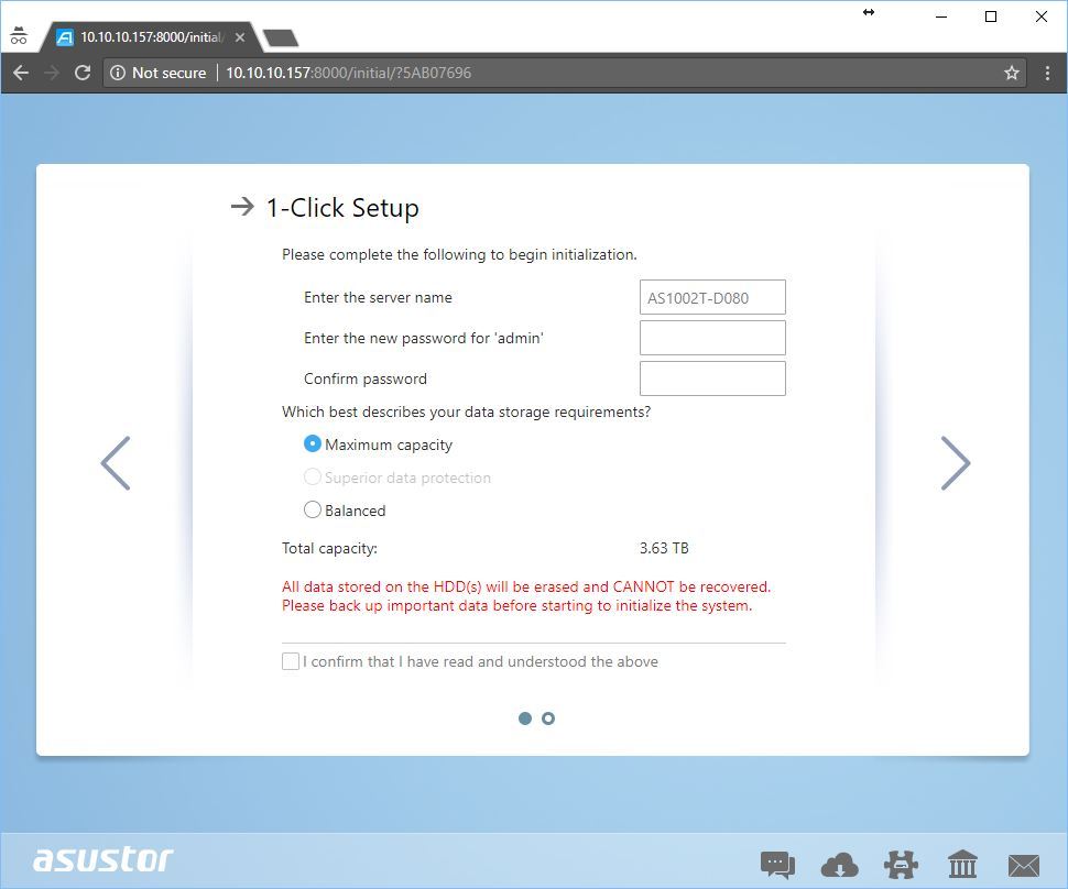 1-Click Setup allocates Maximum capacity to be used with provided drives. In the Custom Setup, you have the option to choose RAID levels in a multi-disk NAS. Once you have chosen your protection level Partitioning and set up will continue on the next screen. This process can take up to 5 minutes.