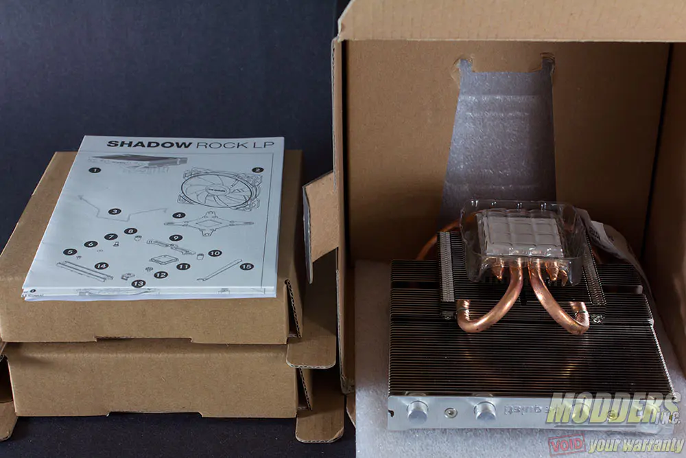 Be Quiet’s products have a uniform black and white packaging cover across all their product line with the left trim indicating the market segment the particular product is aimed towards. For the Shadow Rock LP, this label has “premium” printed on the side. The contents inside are padded with folded and reinforced cardboard.