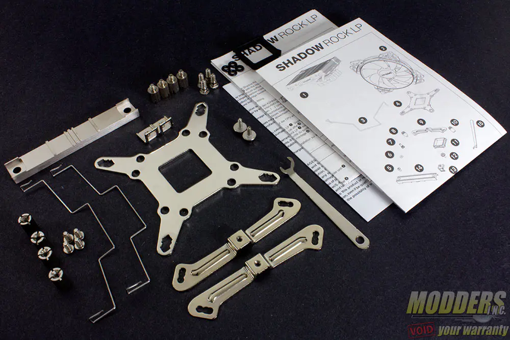 Accessories bundled with the Shadow Rock LP include illustrated user manuals, backplate and mounting support for AMD and Intel motherboards, one set of fan clips as well as a hex spanner.