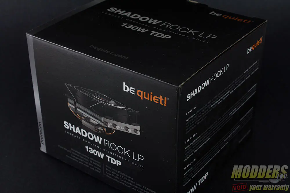 [sc:sponsor sponsor=”Be Quiet!” product_link=”http://www.bequiet.com/en/cpucooler/570″ product_name=”Shadow Rock LP CPU Cooler” product_price_link=”http://amzn.to/1knWWfn” product_price=”$44.90 (MSRP)” ]The packaging is very compact with a simple yet effective labeling. There is not much in the way of padding inside which is understandably considering the cost. However, the heatsink unit is held in place by cardboard holders at the bottom to minimize movement during transport. Dimensions and measurements are given on the box as well so potential buyers get an estimate of compatibility with their system.