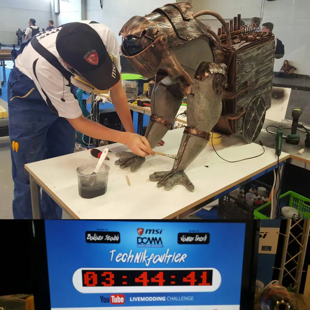 For the 24-hour Live modding event, multiple teams of two took eight hours a day across three days to create an original casemod. Stefan Ulrich and Kathrin Diederich’s “Call the Doctor” Doctor Who-themed mod was constructed on site and won top prize. George Kähler and Simon Krause built a very clean tower case dubbed Concept 16. Ali Abbas with Monia Reuter took 3rd Place with a Tribute to H.R. Geiger PC.