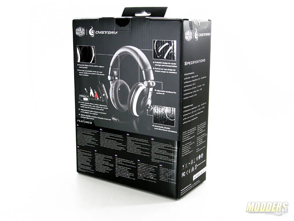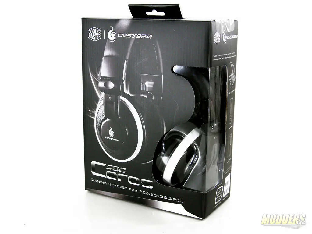 Newer CM Storm packaging has moved away from the black and red color scheme to a simpler black and white package. A viewing window on the right side allows a preview of what the Ceres 500 headset looks like as well when you see it in a retail store.