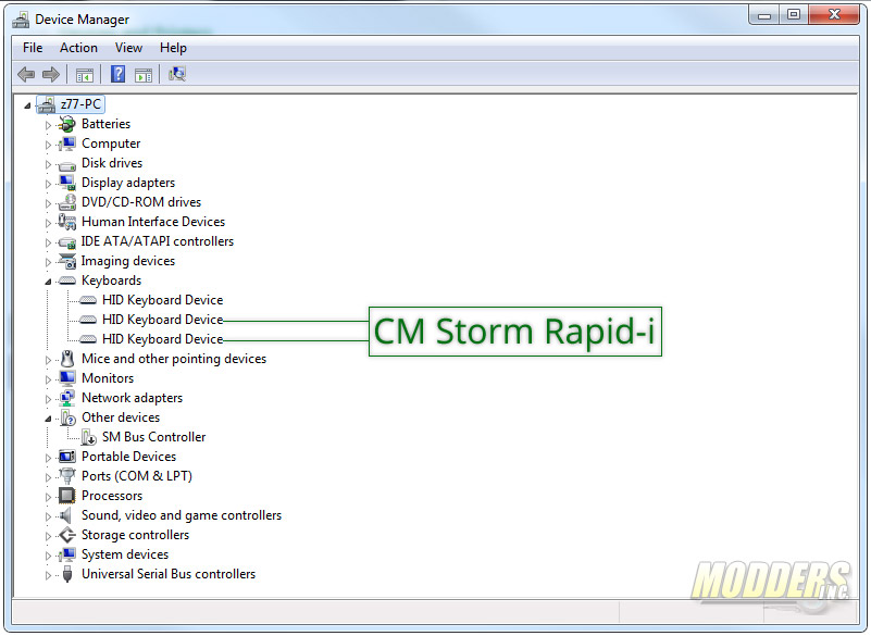 The CM Storm QuickFire Rapid-i has N-key roll-over function over USB. This is achieved in the same way the CM Storm QuickFire Pro does it, with two Keyboard HID interface implemented in Windows Device Manager. The limitation of this NKRO implementation however is that functionality is limited to the Windows operating system environment.
