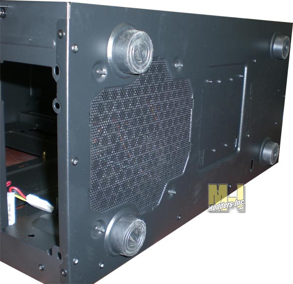 Revealing the 5.25” drive bays (thanks for leaving the mesh knockouts out of the case- I never understood the necessity for leaving them in there) and the large 200mm red LED hi cfm, low speed low noise fan. I’ve used fans like these in the past- from the 120mm all the way up to the 230mm fans in the Cooler Master HAF932 and they are extraordinarily quiet fans. The case instructions say that if desired you can swap out the 200mm fan for two 120mm fans should you so desire (not included). ![]() The bottom of the case has rubber feet to elevate the bottom off of whatever surface it is sitting on for ventilation for the bottom-mounted power supply (accepts Standard ATX PS2 / EPS 12V power supplies) and the case bottom has a fine fabric mesh (that pops on and off from the outside) to make it easy to keep things clean. If this case is on a hard surface, you will be in good shape. If it is on carpet, I fear the smallish feet will sink into the carpet starving your bottom mounted power supply the access to a supply of cool air. I’d like to see a little larger diameter foot, maybe something that runs from one side to the other. You could go taller, but the looks would suffer. Careful what you site this on. ![]() Now, onto the little added extra that is so simple- the “palm hitting forehead” moment. I wondered what the extra little bracket on the back of the case was for, and after pulling out the stock bracket and looking into the bag of included items, found the answer. Cooler Master calls it “Storm Guard”. It is meant for securing your peripherals to the case. If you are the type to drag your system to LAN parties and want to walk away for a bit, with this nice super-simple feature, you can lock your wired mouse, keyboard, or anything else with a wired connection to the case- protecting it from “that guy” once you walk away. This is such a nice touch- simple, effective, and it works! ![]() ![]() You can see in the picture below how you thread the components cord through the slotted heavier gauge bracket, then fasten it down with a thumbscrew. ![]() If I were to use such a feature like this, I’d either bend the tab into the case- making the thumbscrew inside, or use a screw that requires tools to keep someone determined from undoing the bracket- it is still a great simple idea that should be standard on all cases. Below is how the “Storm Guard” looks when used. ![]() Overall construction and sturdiness of the case is excellent- no flex in the case at all, and the doors are very rigid as well- speaks for the quality and thickness of the materials that were used, Very nice. Summing up the exterior, the Enforcer is sinister, clean, and will age very well- both in looks and in durability- better than the hockey player would. |