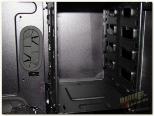 Side panel removal is pretty straight forward, just remove the thumb screws at the back of each panel and slide the panel backwards and off. Now we have or first look at the chassis of the Cooler Master CM Storm Scout 2.