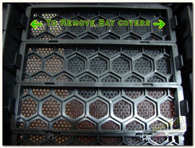 Once you have the front panel off, simply turn it over and press the release clips, shown in the right picture above, and push the drive covers from the front of the panel past the clips and your now ready to put the front panel back on. Just hold the front panel up to the chassis and align the push pin type clips with the chassis holes and snap it back on. Your now ready to slide the optical drive through the front panel and into the chassis.