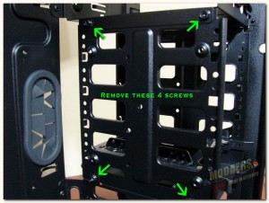 To remove the HDD cage to make it possible to use a longer video card, you must remove the five screws holding the HDD’s side panel on. There are four scews on the side of the HDD cage and one more on the rear of the HDD cage. I have pointed out the first screws above in the left pic (but do not forget the one in the rear). Note: In doing this you will loose the four upper HDD slots, and you will also loose a 120mm fan mounting location.