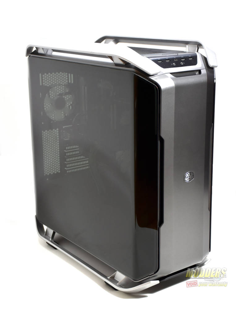 Going around to the rear exhaust of the Cosmos C700p. On the top there is the standard cut out for an I/O shield. Nest to that is a spot for an exhaust fan. The Cosmos can take either a 120-mm or a 140-mm fan in the exhaust. Being a full tower, there are a total of 9 expansion slots on the Cosmos C700P. The bottom has the mounting bracket for a standard ATX power supply. This entire panel, like so many other parts of the Cosmos C700P, is removable and reversible. This would be done if one wanted to build an inverse build in the Cosmos. The front and rear panels are both double curved panels. However, where the back panel is made of steel, the front panel is tempered glass. The glass is tinted, giving it the mirror effect. This also allows any interior lighting to really stand out when the PC is powered on.