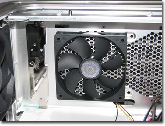Now comes the time where we pull the side off the Cosmos-S and see how the inside is setup. From first glance we can see that the wiring is neatly tied together to key them in order during shipping. One of the main differences between the Cosmos-S and the original Cosmos is the chassis is constructed from aluminum instead of steel. This gives the Cosmos-S a slight advantage in the weight category as well, coming in at 30.4 lbs compared to the Cosmos’s 41.6 lbs. Another notable difference between the two is the hard drive cage areas. The Cosmos had 6 drive bays which slid in from the side of the case. The Cosmos-S however has a standard drive configuration which uses a special drive cage insert that we will discuss a little later on. Looking at the upper rear section we will find the standard rear exhaust fan (120mm) that is included, which mounts beside the rear I/O panel. Below those are the standard 7 PCI expansion slots. Further down we will find the PSU mounting area. We can see in the below image that the intake for the PSU is meant to be facing the bottom of the case and does utilize a filter. With minimal components installed this will not be to bad to clean. However, if you have a fully packed system, this might pose to be an issue. Install one of the higher wattage non-modular power supplies and you will find that the filter handle and space in front of the lower fan mount are quickly being covered up. Now if you plan things out and plumb the majority of your cables behind the mobo tray, you will have less issues trying to clean the PSU intake filter. I personally liked the original Cosmos’s lower filter system a little better. Both the PSU intake filter and the front lower intake fans filter could be removed and cleaned without having to remove the side of the case. Although getting to the rear one might have been an issue for some users. Below to the right we have the one included hard drive cage. This cage will hold a total of four 3.5″ hard drives. The cage also utilizes an anti-vibration system that is kind of unique. Most anti-vibration systems consist of small silicone rubber grommets used when mounting the hard drives. It has the standard cage that mounts four drives sandwiched between two outer panels. These panels have four prongs on each panel that fit into four silicone rubber grommets on each side of the cage. The hard drive cage also has a 120mm Red LED intake fan mounted to the front of it using four plastic pins. The setup is relatively easy to remove and relocate in different drives bays. The only thing that is going to slow you down is how well you handle your wiring. The Cosmos-S only comes with one of these cages stock, but one can purchase addition cages from Cooler Masters Store for only $9.99 US. So adding additional hard drives will not cost you an arm and a leg. Looking at the upper section of the drive cage we will find the tool-less drive locking system. Now, I personally am not a fan of tool-less designs beyond the use of thumbscrews. The Cooler Master Cosmos-S uses the same tool-less locks that the original Cosmos uses. A simple push of the button and the lock will engage to hold the drive in place. Another push will release the lock so the drive can be slid out. These work just like the standard click type ball point pen. They have a pair of springs on each side that keep pressure against a small gear located under the button. At the top of the chassis, we find mounting locations for three more 120mm fans. Cooler Master has included one fan mounted in the rear position. Not only has Cooler Master given us the option of mounting three 120mm fans in the top of the chassis, they also give us options on how we choose to mount them. Looking at the image on the right, we can see the fan is mounted internally. Well, you can also mount the three upper fans on the outside under the top panel, which would make hiding the wiring for the fans a lot easier. To top it all off, if your into water cooling, you can easily mount a 120, 240, or a 360mm radiator in the top of the chassis. What more could one ask for in cooling options? Although not all users are going to be concerned about cable routing options when they are purchasing a case, it is a important part of the decision for those of us that want something to look and perform up to par. The Cosmos-S has the same basic options as the original. The only major difference here is the hard drive area. Looking at the rear of the chassis, we can see that there are several large holes to allow users to route the cables behind the hard drive cage and mobo tray areas. One helpful hint that i will give you right off. When routing the cables behind the mobo tray. Keep them neat and as flat as possible. The side panel for the case has a rather thick frame structure on it, and it will become an issue if you overlap to many cables behind the mobo tray. There is plenty of room to handle most cable configurations on a setup here, but if you run a large high wattage power supply that offers every cable in the world and you only use a few of them. You might find hiding them all to be a real challenge. So take your time and utilize the cable tie options Cooler Master includes with the Cosmos-S. The Cooler Master Cosmos series utilizes a unique side panel latch system. Although the Cosmos isn’t the first chassis to use a unique side panel mount such as this. I do feel that Cooler Master has come up with one of the best options. In the locked position, the tooth of the latch is toward the rear of the case. As you lift the lever(s) in the rear of the chassis, the four teeth slide forward releasing the top of the side panel from the chassis. This allows you to gently lean the panel out and lift it off the lower lip at the bottom. The only thing that caught my eye here is the front to rear alignment of the panel. Taking the time and money to put a high dollar finish on the Cosmos / Cosmos-S, you will find that when installin