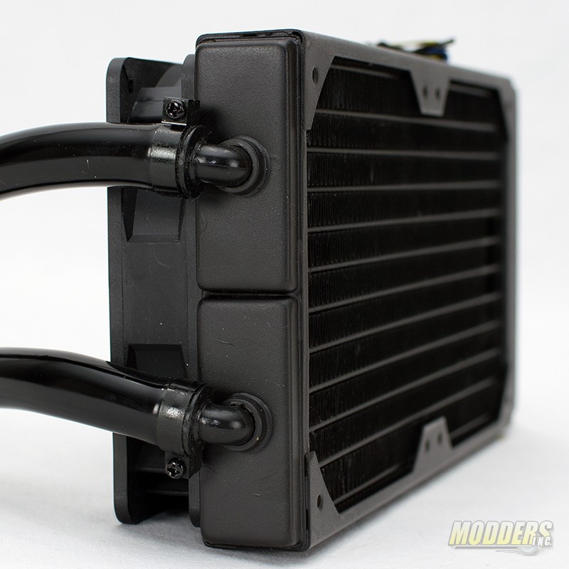 The back side of the Cooler Master Glacer 240L CPU Cooler radiator give a clear view of the fins. This particular radiator reminds me more of a heater core from an automobile rather than a radiator. That is not a bad thing. A heater core is designed to pull heat from the water and with the help of a fan, blow warm air into the passenger compartment. The same principal would apply here.