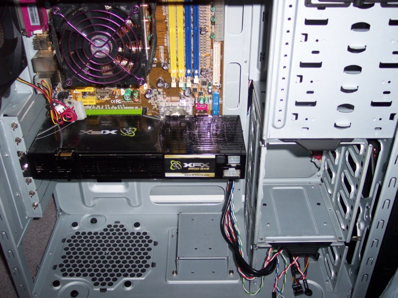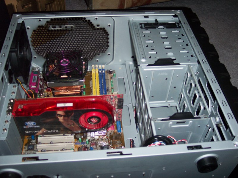 I installed a typical sized motherboard into the case and loaded 2 different sized video cards into it so that you could gain some perspective regarding the working area in the case. I used an AMD/ATi4870 graphics card to represent the 9.5 inch variety, and a 9800gx2 to represent the 10.5 inch variety. The largest of the large cards is over 12 inches, but I don’t have one of those to work with (NVidia or AMD, if you are listening… *hint hint*) First, the normal 9.5 inch variety: ![]() As you can see, the 9.5 inch cards will pose no problem. Since they are no longer than the motherboard is wide, they will fit without alterations. Next is the 10.5 inch sized card: