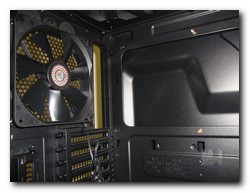 Moving on to the rear fan area we see that Cooler Master has included a 140mm exhaust fan. The exhaust fan can be substituted with a 120mm fan or even a 140mm water cooling radiator. There are also three grommeted coolant line holes just above the fan. And just when you thought you had seen all the fan options for this case, Cooler Master added an option for up to two 120mm fans behind the HDD cage. Folks that makes for a ton of fan and radiator options! Honestly, I did not even try to count them all.