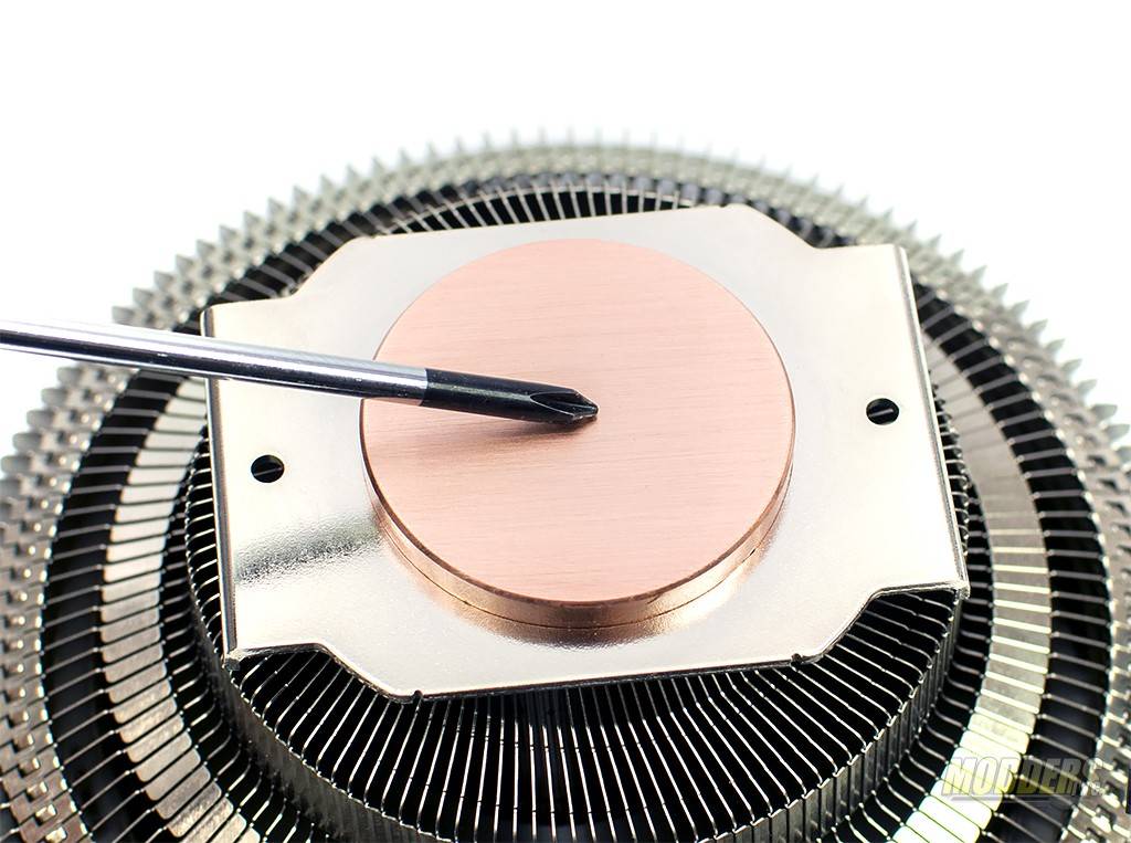 The heat column is made of copper and as I mentioned before, it is designed to sit on top of the IHS of the CPU. The base is machined flat however, there are machining marks present in the base of the cooler.