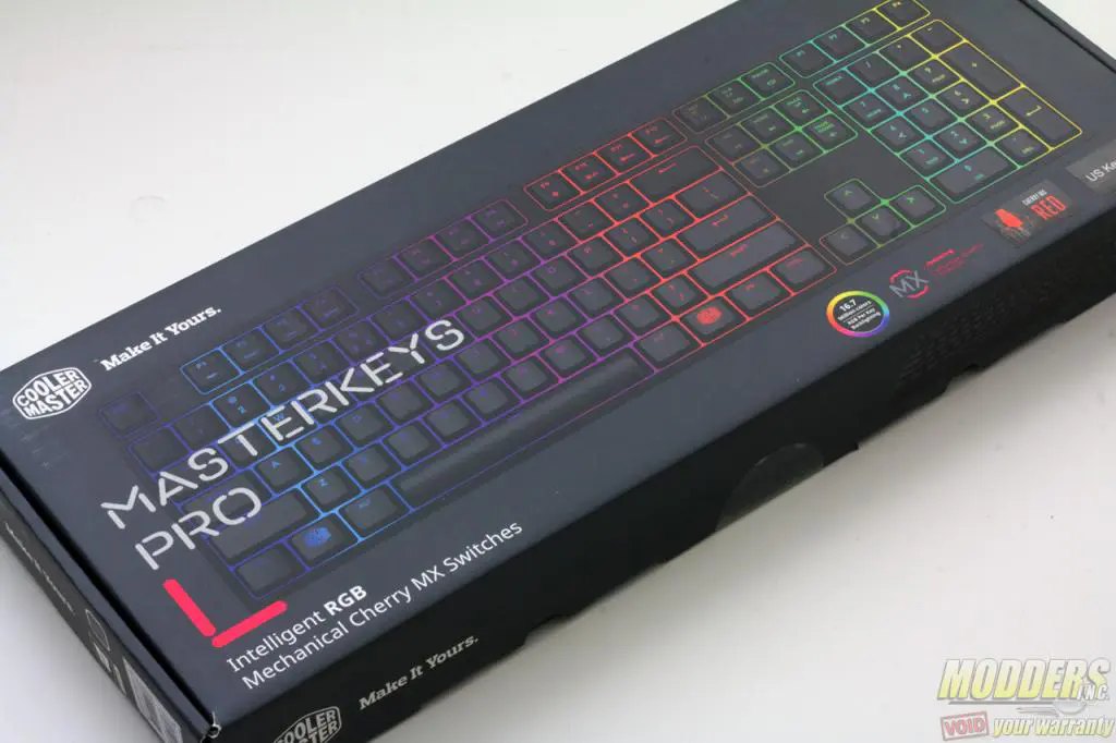 More than a name change from the QuickFire series, the new MasterKeys Pro L also sports new box art styled in the same vein as Cooler Master’s current “Make It Yours” crop of products. A full-size view of the MasterKeys Pro in print lets buyers know that this is the “L” full layout version as opposed to the “S” tenkeyless version. Localized layouts are available, indicated with a sticker on the side and the switch type is also printed on the box cover to separate it from the two other switch options.