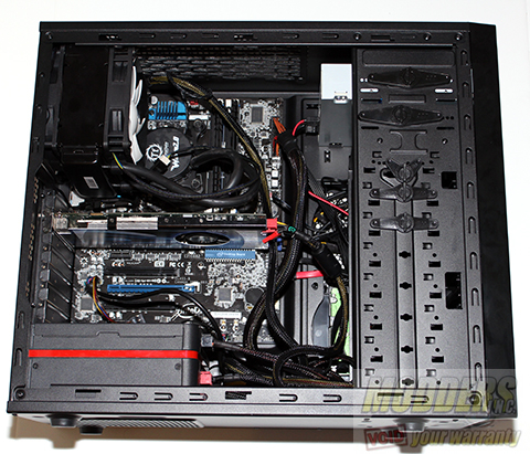 As we pull the other side cover off we can see the lack of options for routing and tying down wires. Cable management is hard enough in most mid tower cases without the the lack of routing holes.