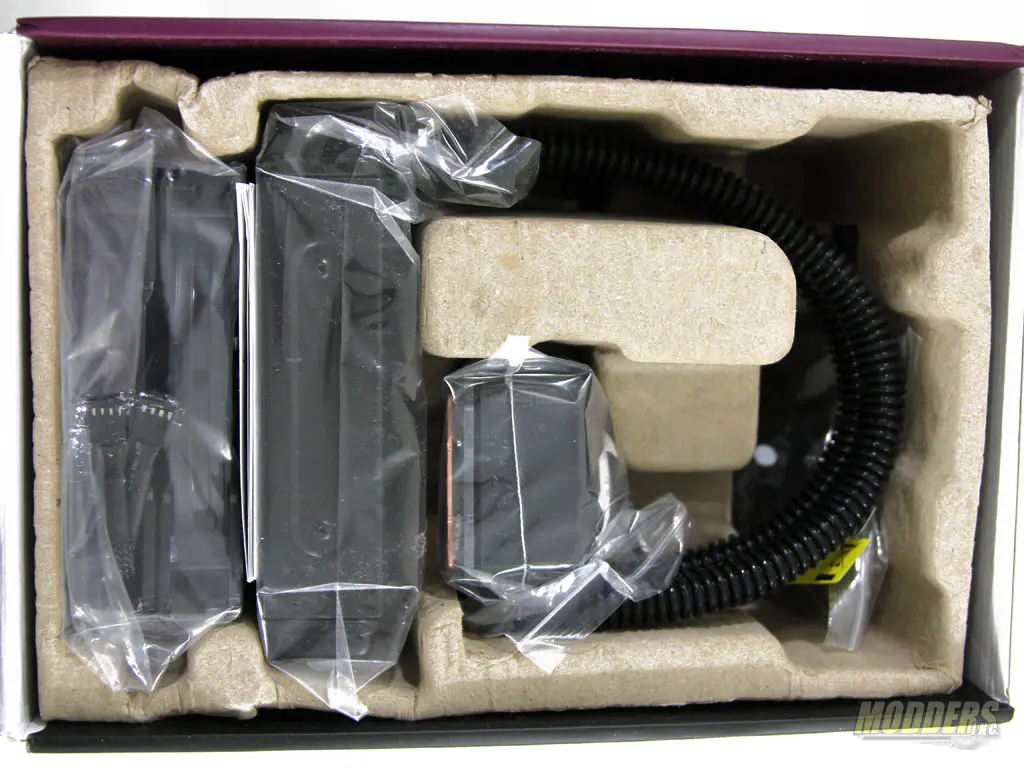 Inside, the recycled carton holds the main Cooler Master Nepton 140XL unit as well as the fans and accessories. The user’s guide and warranty sheet are tucked in between the radiator and the fan compartments.
