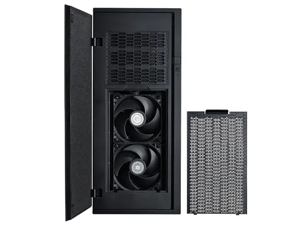 Optional removable covers on the top and side panel allow users flexibility with the ventilation or noise control while cooling is handled by three new Silencio FP 120mm fans (two for front intake and one for exhaust). These Silencio FP (fan pressure) fans use loop dynamic bearing and carry a 160,000 hour life expectancy and IP6X dust-proofing.