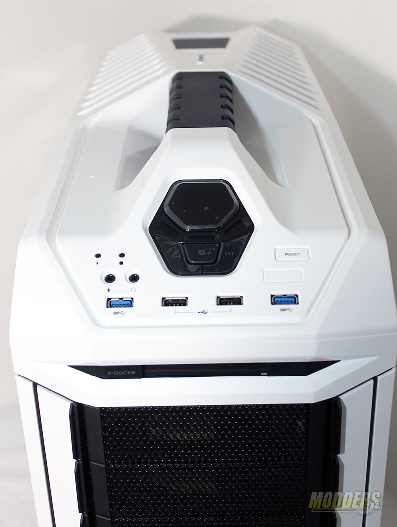 Here see are looking at the master control center for the CM Storm Stryker. The gloss black buttons are a great visual and contrast to the all white case. These buttons are used for the main power (lower center) and the fan controller. On either side of the main power switch you will see [-] and [+] which tells you what button will decrease or increase the speed of the fans. Just to the left of the main controls you have the power and HDD activity LED’s while just below them are the mini-jack for your audio out and microphone inputs. Jumping to the right we find single white button that is used for the power reset of the PC. Finishing out the lower row we see some USB ports. The two outer ports (blue) are for connections to the USB 3.0 inputs on your motherboard while the two inner ports (black) are for using them with any USB 2.0 connections.
