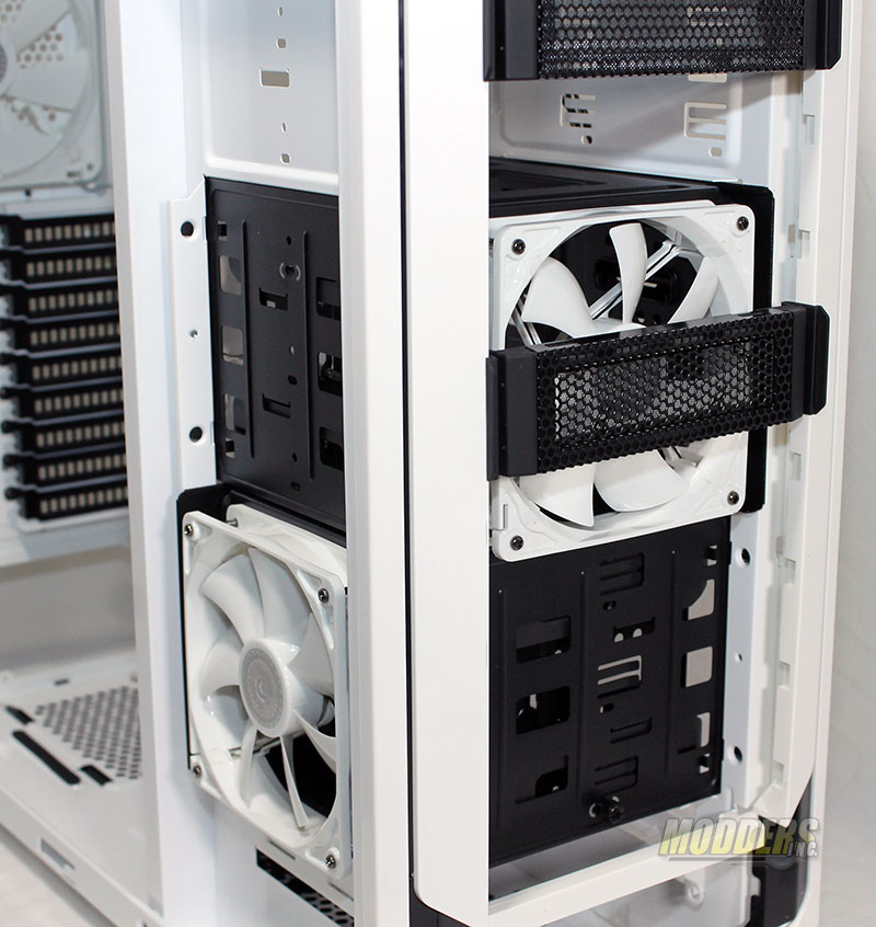 No need to remove the attached fan as the drive rack mounts far enough back into the case that the drive bay covers go right back into place.