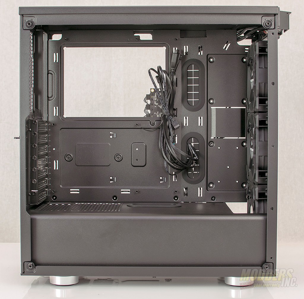 With all the panels off, you can see the iCUE 465X is fairly spacious on the inside. The case supports ATX, MATX, and ITX motherboards. There’s nothing to impede the installation of components from the back of the case to the fans at the front. The motherboard tray features a large cutout to enable access to the back of the motherboard when installing CPU coolers. There are also two cutouts with grommets for feeding cables and wires from the backside of the case as well as an additional cutout and grommet on the power supply shroud.