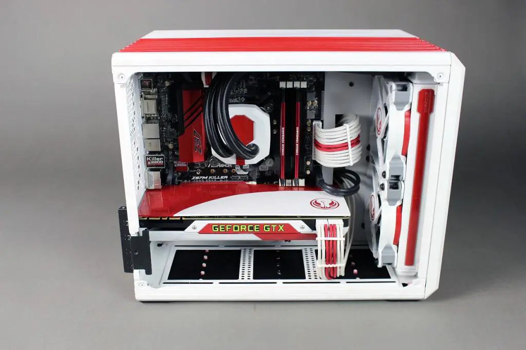Introducing the Corsair ARC 240, a chassis worthy of leading a battalion of troops into battle! Both inner and outer panels where treated with the same flat white paint jobs with banner red accents. The once perforated motherboard panel has been hidden away with a nice solid aluminum motherboard skirt to hide all the unnecessary holes, and the side panel that once was indented and speckled with holes has been replaced with a smoked acrylic custom window to show off cable work and mimic the visor of a trooper. Inside we are greeted to a custom painted GeForce GTX 980ti, as well as matching fans clad in the symbols of the Galactic Empire. Corsair’s H110i GT AIO was also given the same treatment. When the system is on, you can see the faint glow of the Corsair logo shine through the paint on the CPU block. To top it off, we made a custom set of short cables using red and white paracord to keep a clean aesthetic and reduce cable clutter.