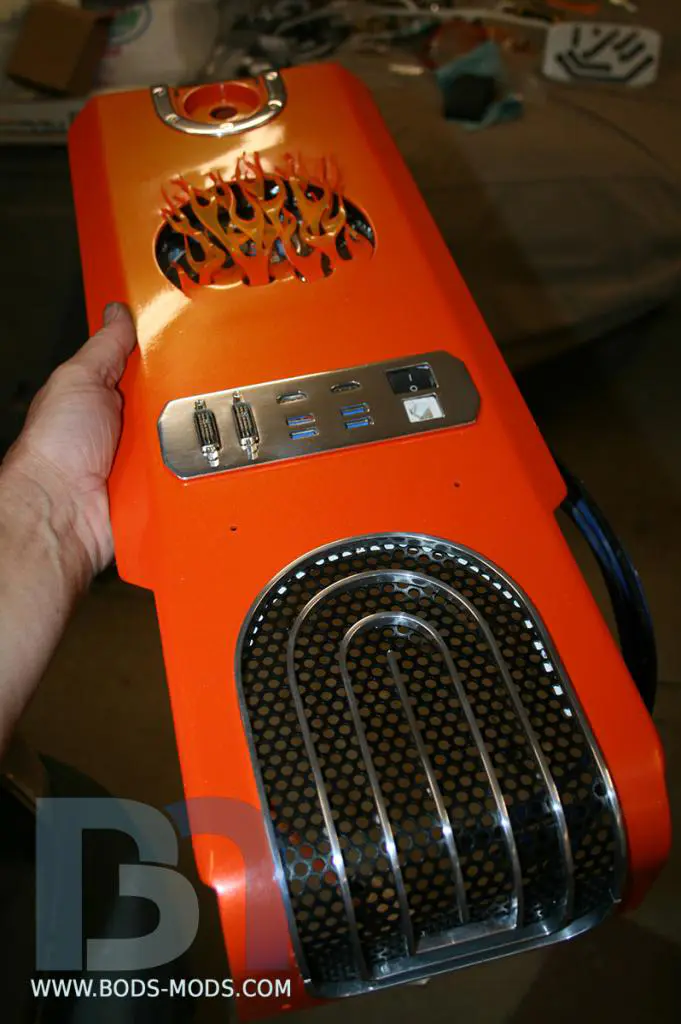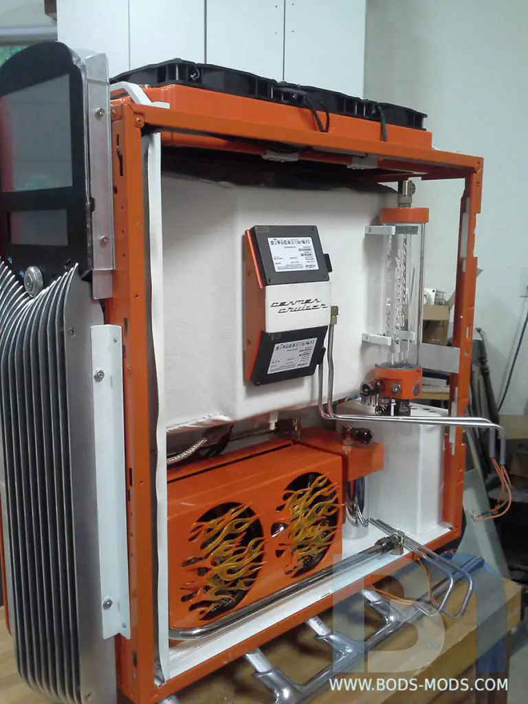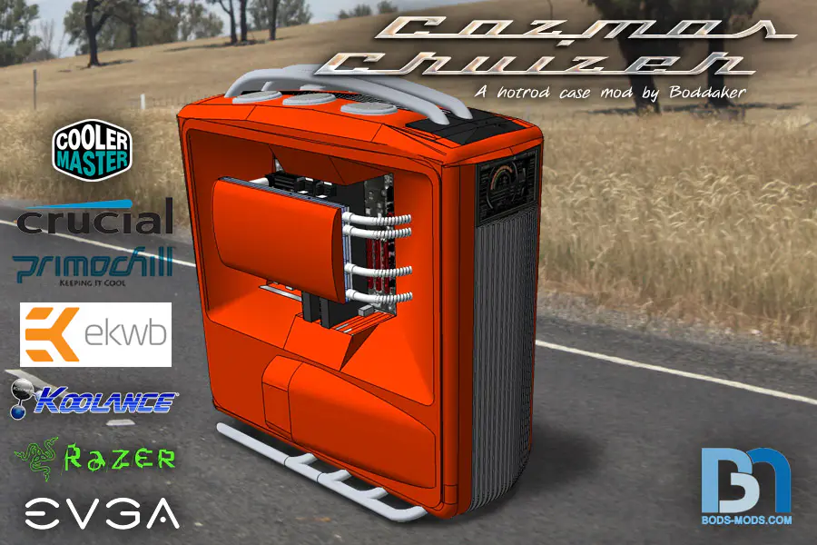 Over the past few months, legendary modder Brian “Boddaker” Carter of bods-mods.com has been working on his Cosmos Cruizer build, taking us through his experience step-by-step in the Modders-Inc forum worklogs on how to build a masterpiece mod. From conception to finish, Mr. Carter puts on a clinic on modding, taking a Cooler Master Cosmos II case and converting it to a hotrod inspired rig. Making a public appearance at the recent PDXLAN25, the Cosmos Cruizer took home the top prize, deservedly so, even with other incredible builds competing against it. Fabricating many pieces himself at home including the fibreglass body and the aluminum stands, the project confirms exactly why he is one of the greatest modders all time.