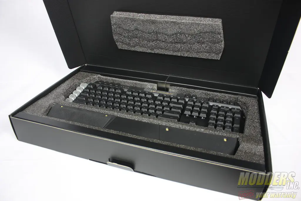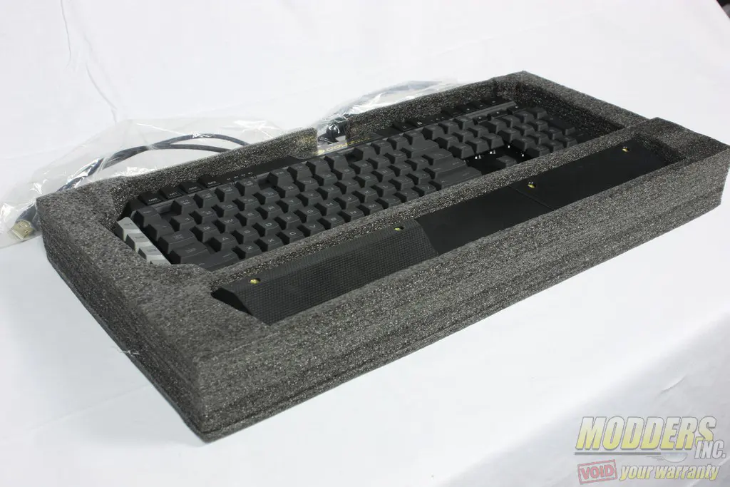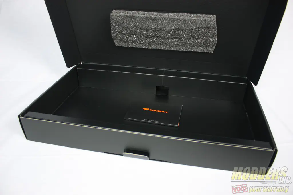 The packaging is opened by cutting through two sections of tape that secure the top section to the back of the packaging. Once the tape has been cut, simply lift the flap towards you and pull up. As you can see the the keyboard and accessory panels are very nicely protected by thick packing foam cut outs. To add to the level of protection, Cougar has also added a section of padding that is secured to the top of the box to keep the keyboard from getting damaged from possible drops or other methods of impact. Once the padding that is holding the keyboard and palm rest is taken out you can see that the classic Cougar instruction manual is sitting in place. This is something Cougar does with all of its products and is a nice touch compared to other companies that simply throw in a piece of folded paper.