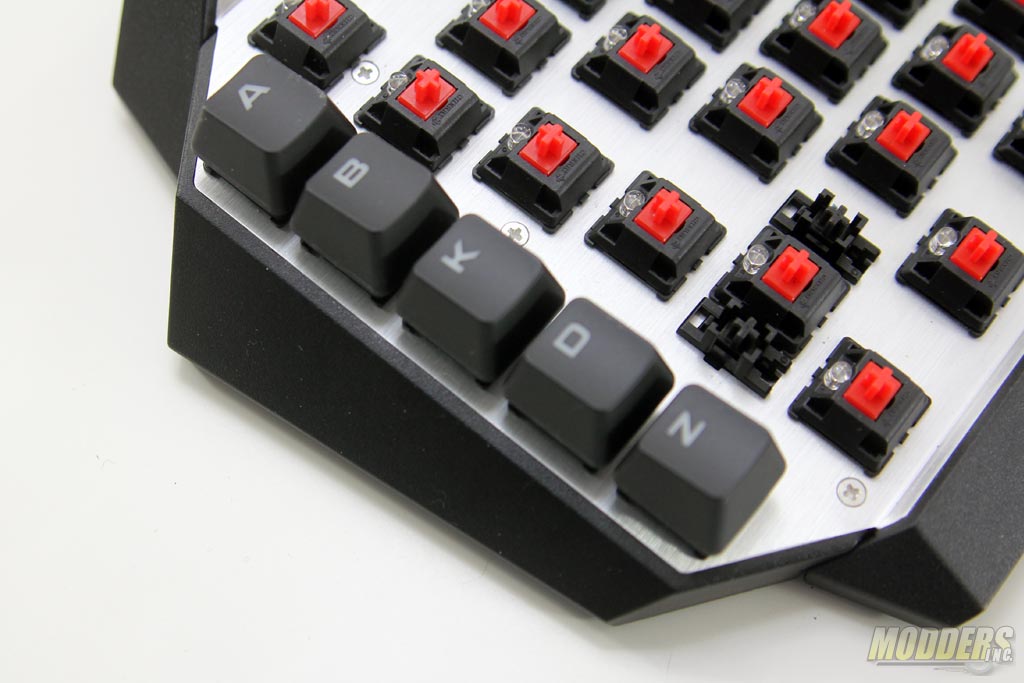The switches are obviously plate mounted on the aluminum cover and it uses Cherry dummy stabilizers for the larger keys. This sample in particular comes in Cherry MX red switches but Cougar provides options for Cherry MX Blue, Black and Brown switches as well.