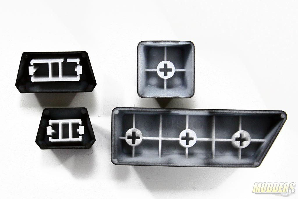 All keys except for the volume control keys have mounts that are recessed standard Cherry MX compatible. The dedicated volume keys are not mechanical, using membrane based actuation. The keycaps have the typical “soft-touch” paint finish found on other backlit keyboards.