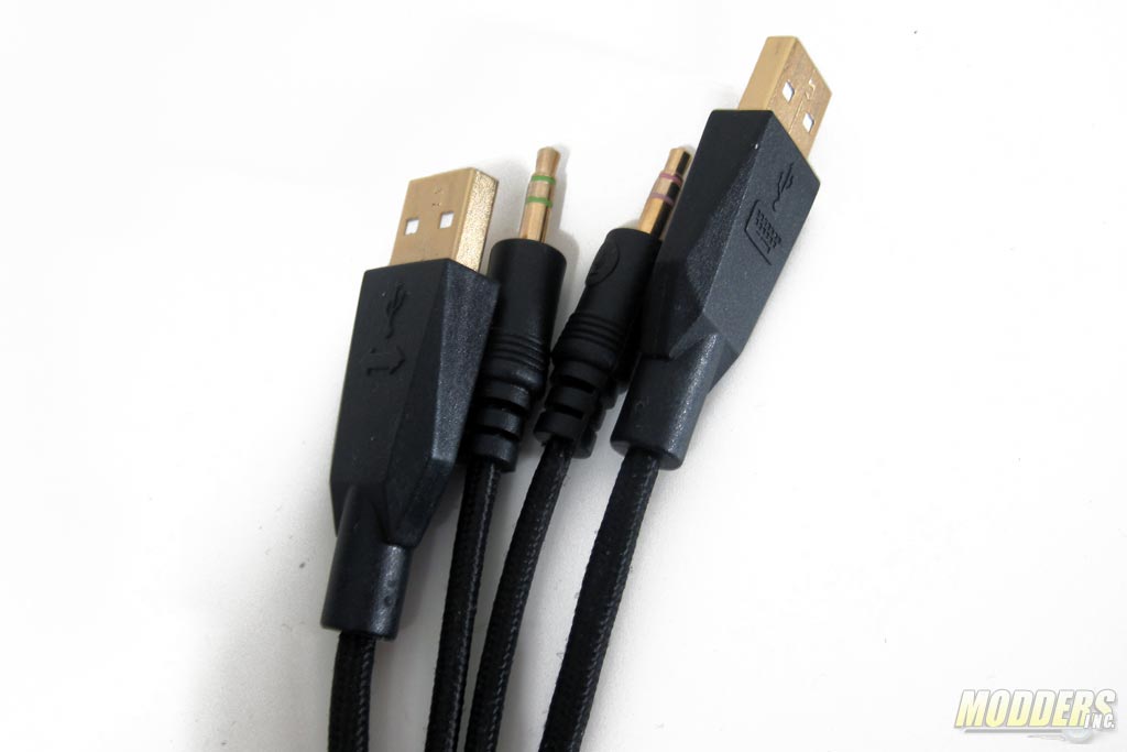 Functional connection is through a single USB 2.0 cable but audio and a separate USB 2.0 passthrough is included. All cables are braided and measures 180cm long in total. Audio connectors are color-coded in the connector ring (pink for microphone and green for audio out) and the USB connectors are marked on the housing.