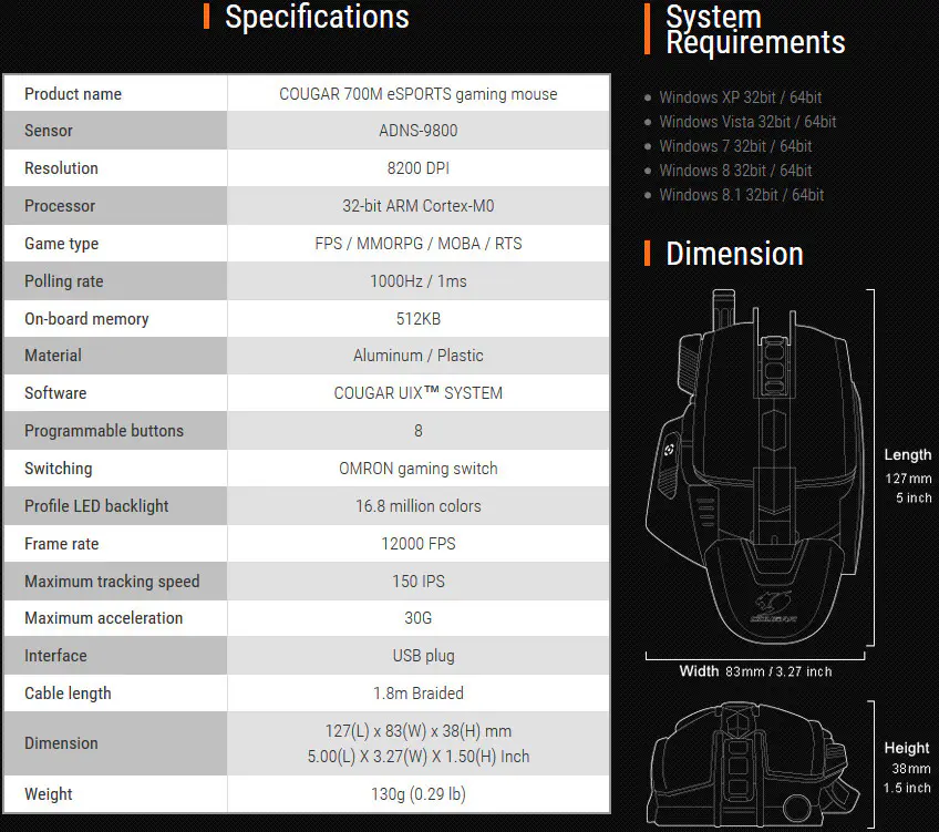 Cougar’s award wining 700M gaming mouse gets a cosmetic makeover this year sporting new “eSports” themed design. The original brown and gray gaming mouse designed by Cre8 Design Studios in Taiwan now comes in a blue and white as well as a red and black variant. Inside, the sensor is an ADNS-9800 with a maximum tracking speed of 150IPS and resolution of up to 8200DPI. Long-life OMRON microswitches for tactile input buttons are used with eight programmable buttons in total. As with all recent Cougar peripherals, the Cougar 700M eSports’ RGB LED and various functions can be adjusted with the COUGAR UIX system software and programmed into the 512KB onboard memory.