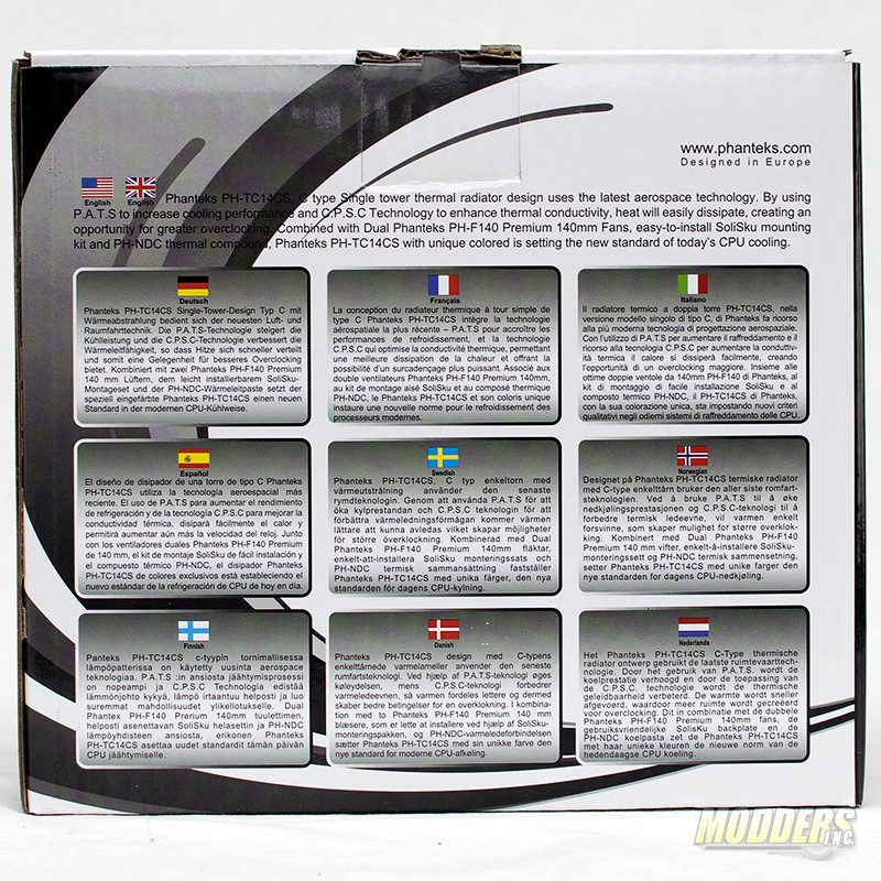 The packaging for the Phanteks PH-TC14CS gives a nice teaser of the cooler inside. The cooler comes in five different colors. The back of the box details the features and a little history of this cooler in 10 different languages.