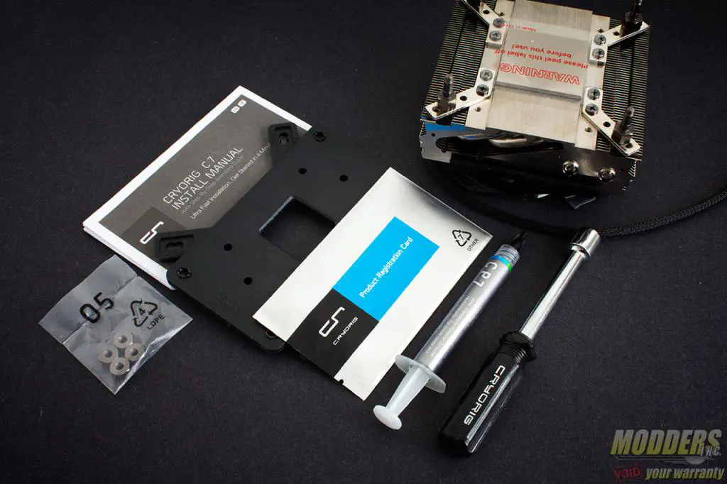 Most of the CRYORIG C7 assembly comes part of the main heatsink body already so there are minimal extra accessories to fiddle about. Aside from the actual C7 heatsink, accessories in the package include a fold-out installation manual, full-size thermal interface material, four hex nuts, universal AMD/Intel backplate, hex nut driver and a sealed product registration card. Signing up as VIP (free) and registering the product on CRYORIG’s website doubles the standard warranty, extends customer support as well as render the user eligible for VIP member prize draws.
