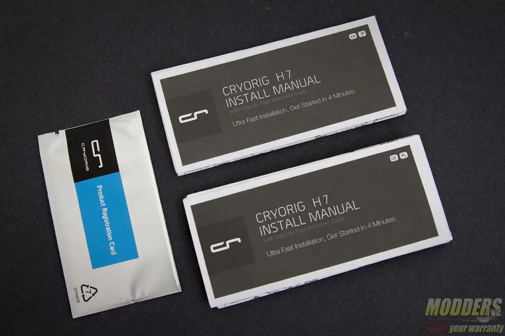 A full-size CRYORIG CP9 thermal paste is also included in the accessory pack as well as documentation which includes an English and Japanese installation manual with an alternate German and Polish version, as well as a product registration card completely sealed in an anti-static bag. Signing up as VIP (free) and registering the product on CRYORIG’s website doubles the standard warranty, extends customer support as well as render the user eligible for VIP member prize draws. Standard warranty for CRYORIG’s coolers is 3-years which means registered products get a total of a lengthy 6-year coverage.