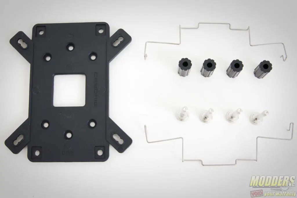 The installation accessory kit seems sparse but this is actually a good thing since it means fewer items to fiddle, easier installation with and less possibility of losing components along the way since there are no miniature parts such as screws. Aside from a universal backplate (made of PBT), four metal screw pillars and four plastic sleeves for the screws which also act as a spacer. The plastic from the backplate and the sleeves is what insulates the metal pillar from touching the motherboard plus there is no risk of damaging the PCB coating even if tightened compared to metal parts, but the PBT structure is more than durable enough to withstand several re-installations. The bundled CRYORIG QF120 fan comes pre-installed with its own set of fan clips and one more set is included for users who want to add another fan in a push-pull configuration.