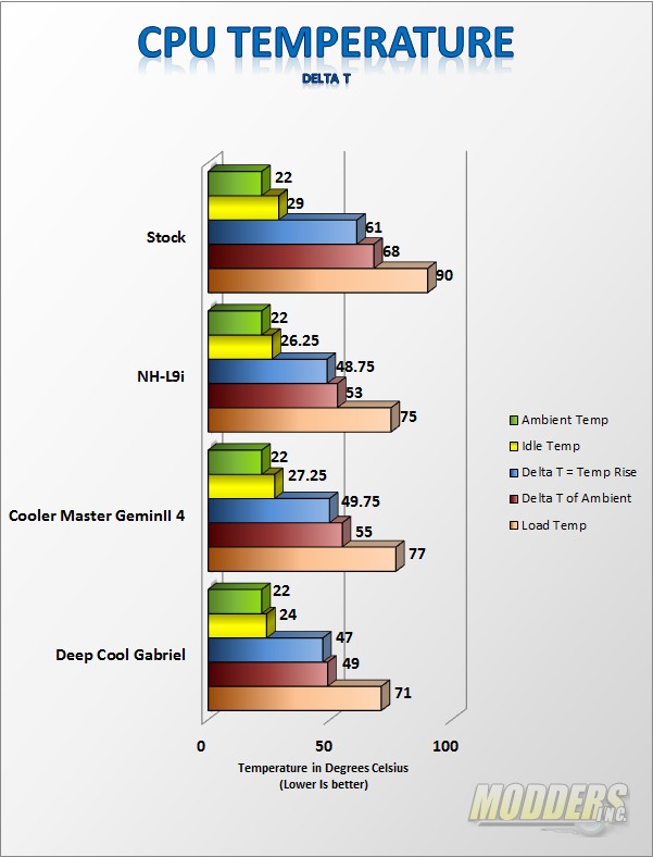 With the ambient temperature removed the equation, we can see that the Deepcool Gamer Storm Gabriel was able to keep the rise in temperature under 50°C compared to the Noctua and and Cooler Master coolers which broke the 50°C mark and the Intel cooler reached up to almost 70°c.