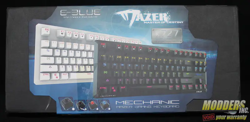 The packaging consists of a cardboard sleeve over a plain black box. The front shows an illustration of the product with the brand and model name at the top. On the bottom, the type of switch that comes on the product is printed with a choice of black (linear medium), brown (tactile non-clicky), red (linear light) or blue (tactile clicky) Kailh mechanical switches.