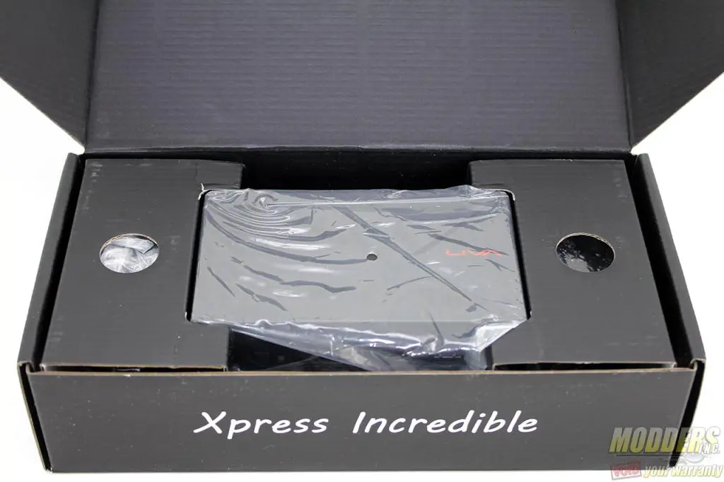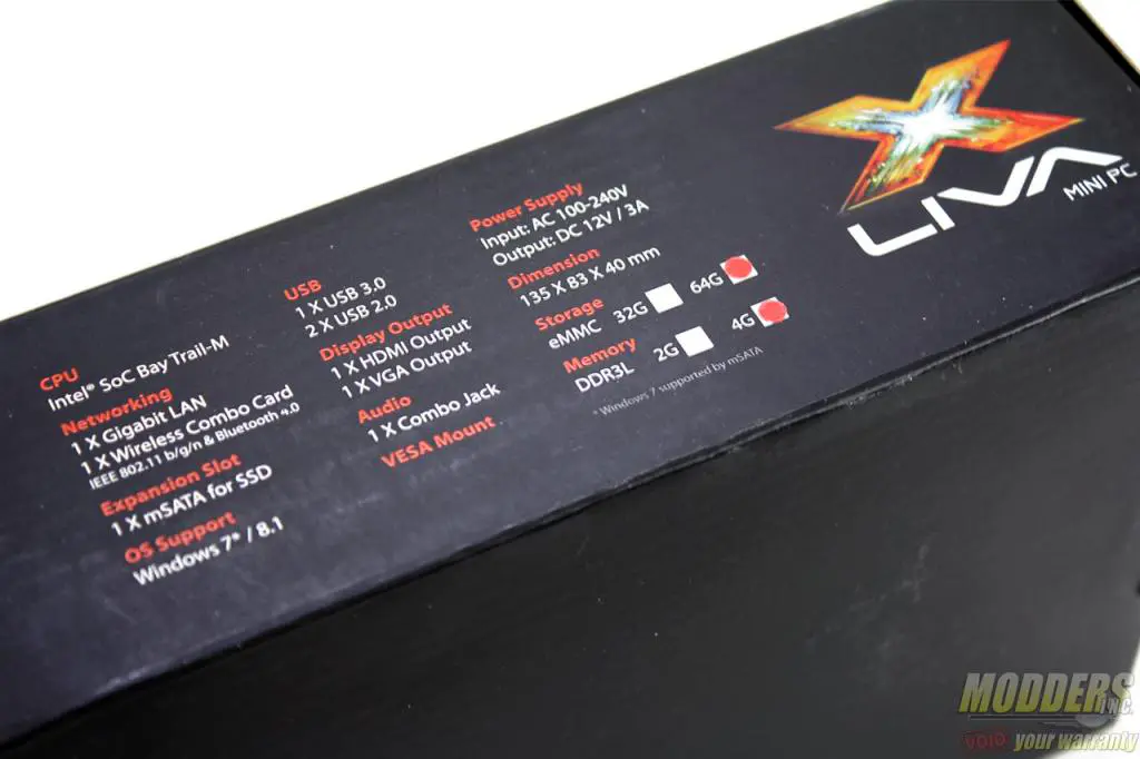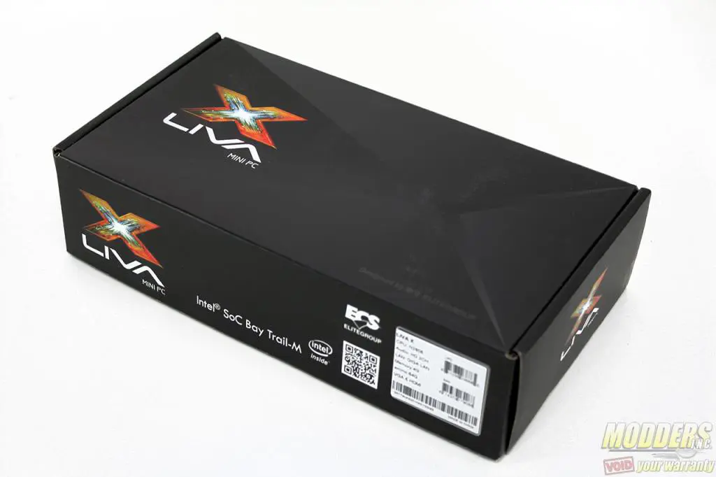 [sc:sponsor sponsor=”ECS” product_link=”http://www.ecs.com.tw/ECSWebSite/Product/Product_LIVA.aspx?DetailID=1593&LanID=0″ product_name=”Liva X” product_price_link=”http://amzn.to/1Ff8bhs” product_price=”$249.99 (64GB), $209.99 (32GB)” ]The ECS Liva X box measures 13.8 x 6.6 x 26mm and has a fairly muted design with only the new Liva X logo to the left side of a matte black expanse but with a subtle gloss accent in the shape of the new Liva X enclosure top. Since the Liva X is available in different configurations, the specifications on the side show what storage and memory capacity the unit inside contains.