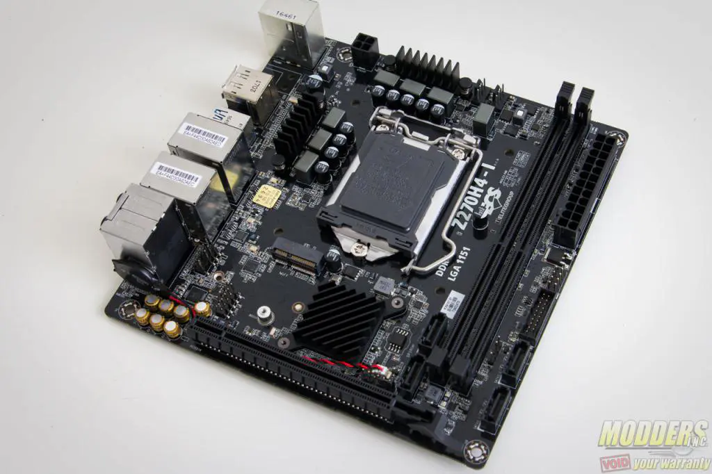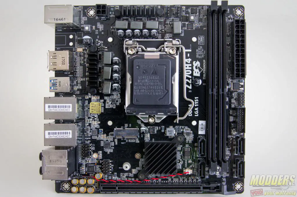 The ECS Durathon 2 Z270H4-I motherboard measures 170 x 170mm and uses a mini-ITX form factor. There really isn’t any strict layout rules for mini-ITX mainboards so it is up to the manufacturer where to place certain connectors. The only clearance issue they really have to abide by is the Intel socket keep-out zone in order to get the Intel sticker printed on the packaging. Durathon motheboards from ECS also use a “triple density”, bi-directional splitting glass fabric PCB which claims to be more durable than typical glass fabric and is supposedly more resistant to moisture.