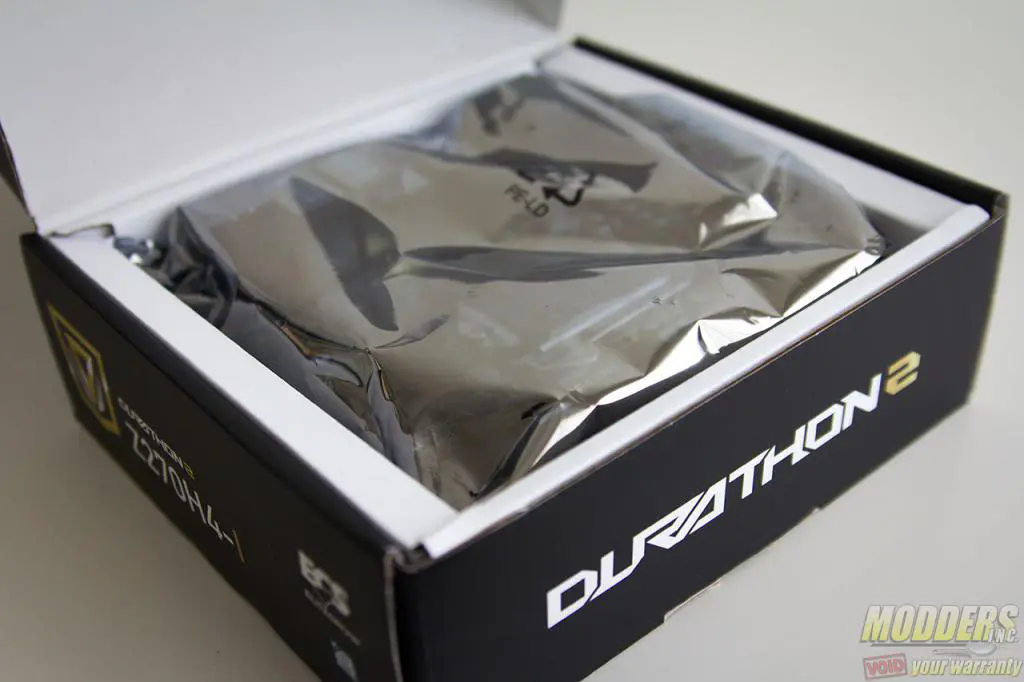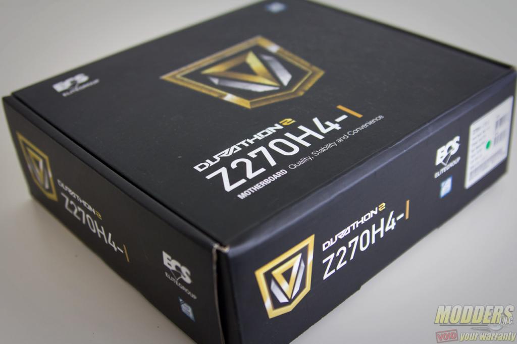 [sc:sponsor sponsor=”ECS” product_link=”http://www.ecs.com.tw/ECSWebSite/Product/Product_Overview.aspx?DetailID=1745&CategoryID=1&MenuID=228&LanID=0″ product_name=”Z270H4-i” product_price=”109/$129 (WiFi Edition)” ]Since the Z270H4-I is a mini-ITX motherboard, it just makes sense that the packaging is equally as compact. While it does not have the ostentatious gold foil packaging of the ECS Lightsaber motherboard, it uses a black and gold theme instead. The Z270H4-I is part of ECS’ Durathon 2 motherboard line and sports that logo front and center of the box. There is actually no photo of the Z270H4-I at all in the packaging except for the diagram of the rear IO at the back of the box.