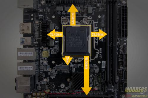 Even though the promotional photos show no heatsinks on the VRM MOSFETs, there two pieces installed for the CPU. These use simple spring-loaded push-pins while the chipset heatsink is held in place by spring-loaded screws at the back. The heatsinks are also all quite small and low profile, so they don’t particularly pose any notable clearance issues.