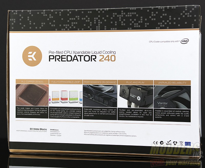 [sc:sponsor sponsor=”EKWB” product_link=”http://predator.ekwb.com/” product_name=”EKWB EK-XLC Predator 240 All-In-One CPU Liquid Cooling Unit” product_price_link=”http://amzn.to/1gP6Lkc” product_price=”$199.95″ ]There is quite a bit of information on the packaging for the Predator 240. On the front of the box you’ll notice there’s an image of the Predator 240 AIO. At the bottom of the front cover, EK lists out the technologies they used in the unit such as, Hovercore, Vardar, Coolstream, etc. The back side lists out some of the features the EK feels really puts the Predator in the spotlight. Using an all copper waterblock, Vardar fans and being fully expandable are some of them.
